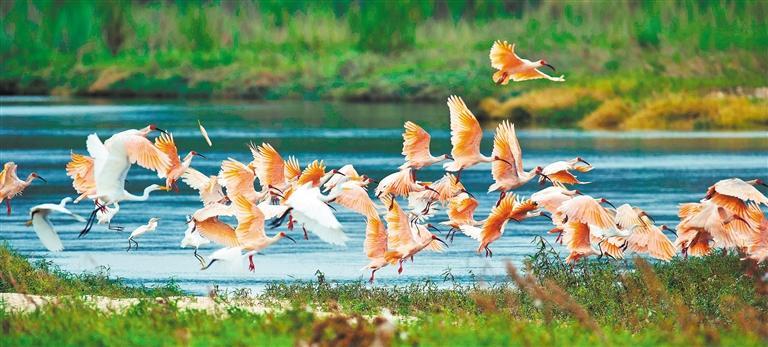 ②5月20日拍摄的陕西汉中市汉江湿地,水清林翠,朱鹮蹁跹。汉中市境内汉江流域有湿地296.76平方公里。近年来,濒危物种朱鹮实现种群复壮。