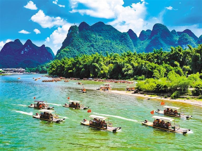 ⑥8月26日,广西桂林市兴坪古镇,游客畅游漓江,感受山水之美。