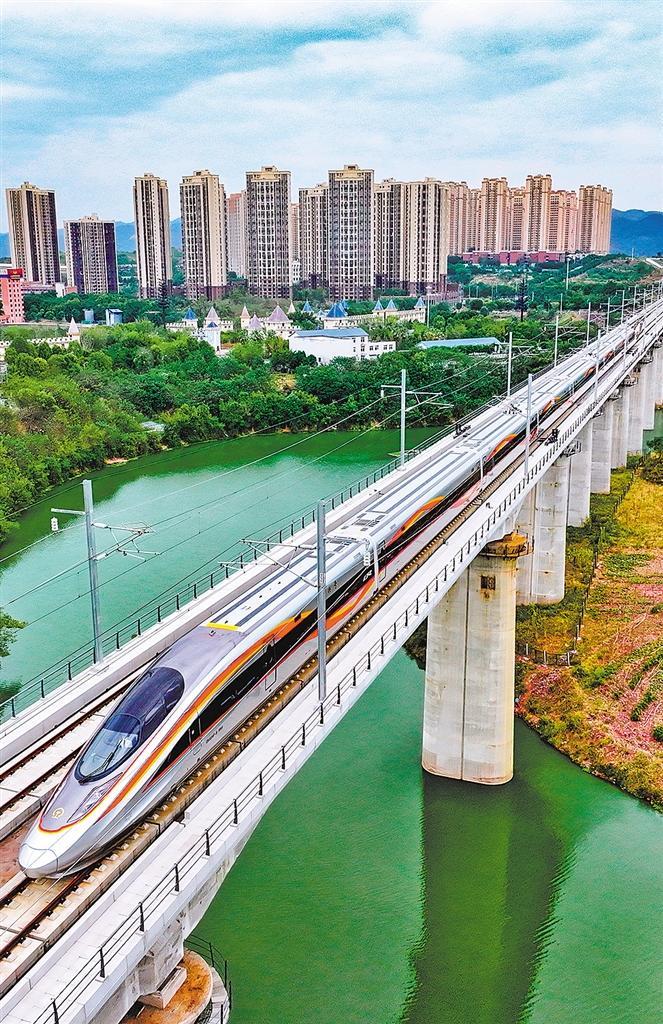 9月29日,列车驶过渝昆高铁重庆高新区巴福镇的三百梯水库道岔特大桥。当日,新建重庆至昆明高速铁路重庆西至宜宾东段正式开通运营。雷 键摄(中经视觉)