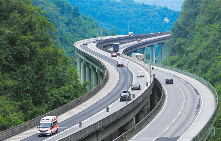 10月6日,车辆行驶在渝湘高速重庆市酉阳土家族苗族自治县板溪镇杉木洞特大桥段。近年来,酉阳大力推进交通基础设施建设,建成以过境高速、国省道、县乡公路、农村“四好公路”为骨架的立体交通网络,有效助力乡村振兴。邱洪斌摄(中经视觉)