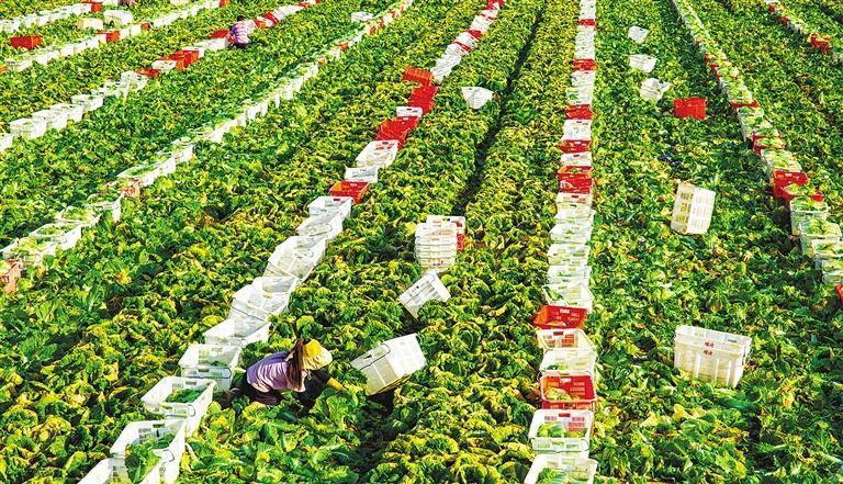 10月6日,甘肃省张掖市甘州区长安镇河满村蔬菜基地,菜农正在采收娃娃菜。金秋时节,当地娃娃菜进入成熟收获期,菜农忙着采收、包装、运销,供应广州、深圳、上海等地市场。