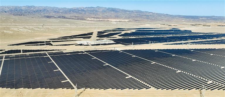 10月6日拍摄的甘肃省嘉峪关市戈壁光伏产业园。太阳能光伏发电站矗立在茫茫戈壁上,夜以继日“逐日”,让“光”变“电”,点亮千家万户灯火。