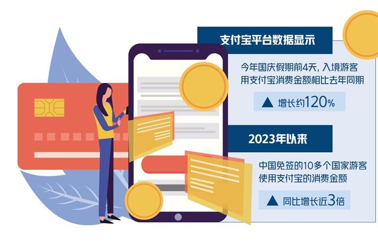 支付宝平台数据显示,今年国庆假期前4天,入境游客用支付宝消费金额相比去年同期增长约120%;2023年以来中国免签的10多个国家游客使用支付宝的消费金额同比增长近3倍。