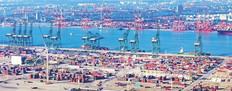 10月11日,天津港码头高效运行,卡车往来穿梭,货轮有序装卸,一派繁忙景象。天津港是我国重要的现代化综合性港口,拥有147条集装箱航线,与世界上180多个国家和地区的500多个港口保持着贸易往来,连续多年跻身世界港口前十强。张明伟摄(中经视觉)