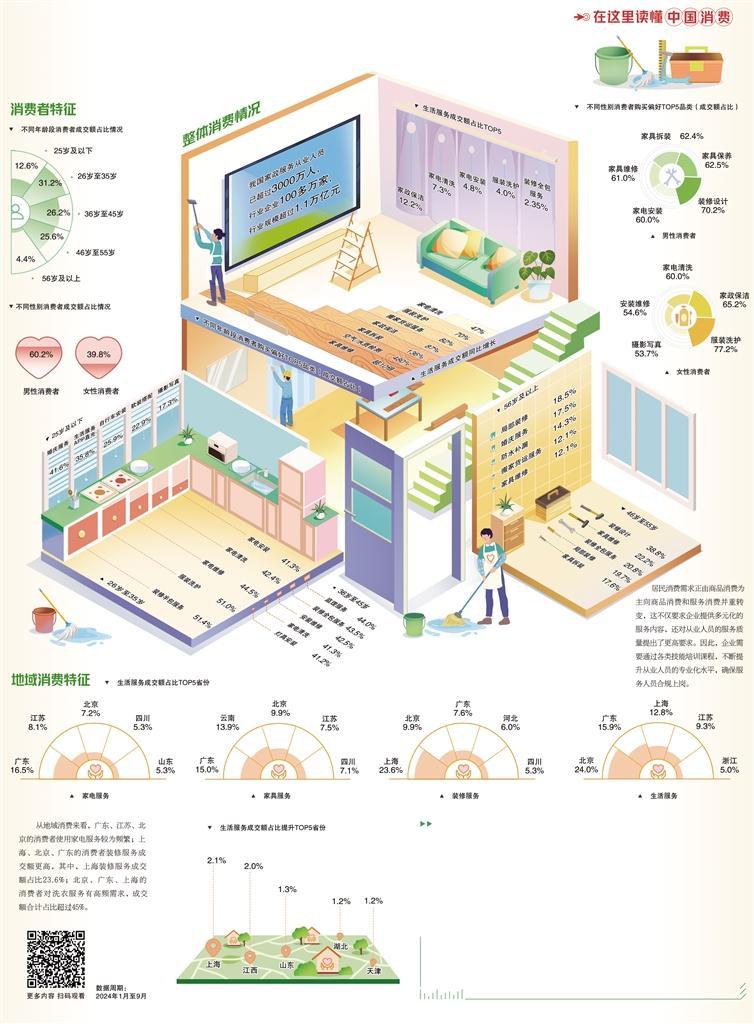 生活服务的消费主力人群趋于年轻化,“90后”成交额占比最高,为31.2%。与“70后”“80后”相比,“90后”消费者对服装洗护、家电维修、家电清洗、家电安装等服务的依赖性更强。从不同性别看,男性消费者生活服务成交额占比超过六成,他们偏好购买装修设计、家具拆装、家具维修等服务,而多数女性消费者更关注服装洗护、家政保洁等家务相关服务。从地域消费看,不同省份的生活服务消费偏好各有不同,上海、江西、山东、湖北、天津等省份生活服务成交额占比提升较多。