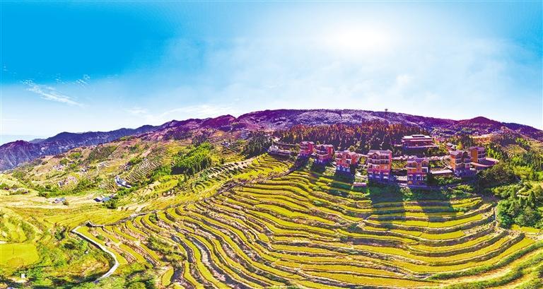10月10日,湖南省怀化市溆浦县葛竹坪镇山背花瑶梯田满目金黄。当天,该县举行以“一粒种子改变世界”为主题的“2024山背梯田农民丰收节”,村民和游客一同打禾、捉鱼,共享丰收的喜悦。