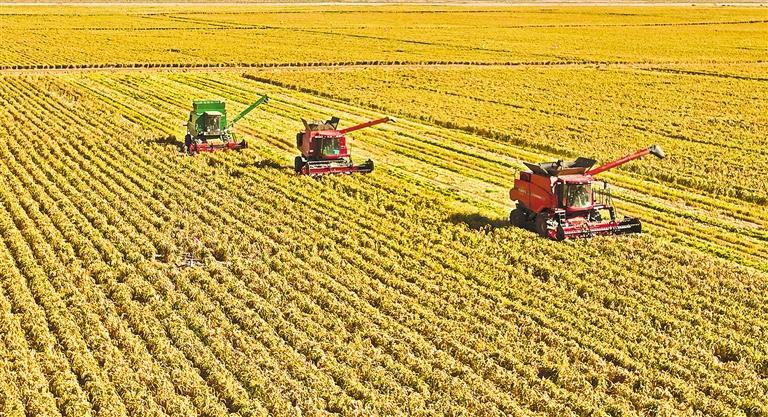 10月12日,甘肃省张掖市高台县高台农投谷子种植基地,大型收割机在收割谷子。今年高台县种植了12000多亩绿色无公害谷子,通过科学施肥、合理灌溉、病虫防控等措施,提升作物品质,确保丰产丰收。王 将摄(中经视觉)