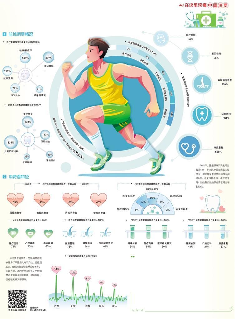 随着人们健康意识的提升,健康消费成为年轻人的潮流生活方式,越来越多人愿意为健康买单。数据显示,医疗服务市场快速增长,用户呈现年轻化趋势,26岁至35岁消费者的健康服务订单量占比已达57%。