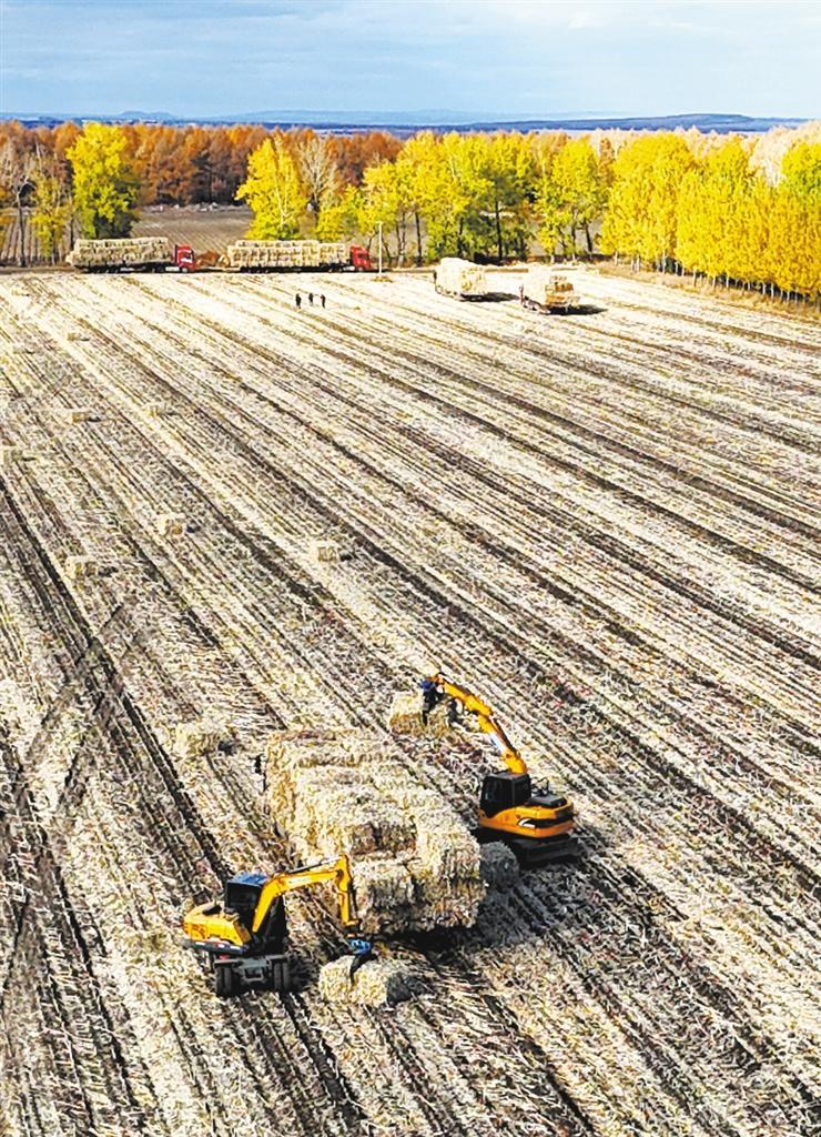 近日,黑龙江黑河北大荒集团格球山农场有限公司职工正在回收玉米秸秆。近年来,北大荒集团推进秸秆“原料化、燃料化、肥料化”利用,有效减轻了秸秆焚烧带来的空气污染。陆文祥摄(中经视觉)