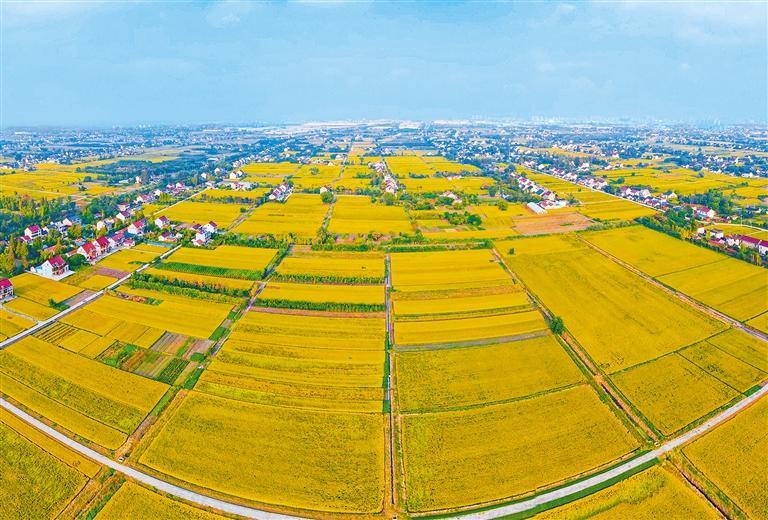 10月14日,江苏省如皋市城北街道邵庄村,金黄色稻田与民居、道路等相互映衬,构成一幅美丽的田园丰收图景。金秋十月,如皋市64.4万亩水稻渐次成熟,进入开镰收割期。吴树建摄(中经视觉)