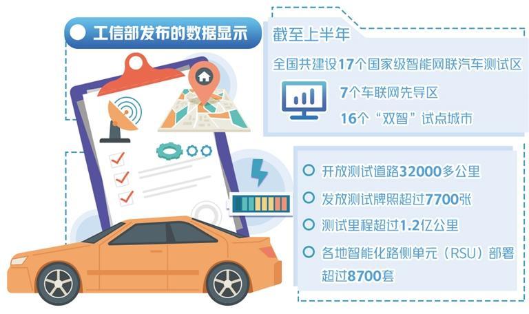 工信部发布的数据显示,截至上半年,全国共建设17个国家级智能网联汽车测试区、7个车联网先导区、16个“双智”试点城市,开放测试道路32000多公里,发放测试牌照超过7700张,测试里程超过1.2亿公里,各地智能化路侧单元(RSU)部署超过8700套。