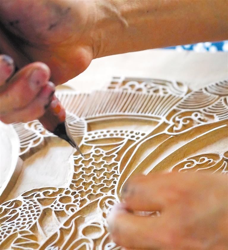 ▶9月19日,位于梁平区仁贤街道的一家木版年画工作室,工作人员正在雕版。