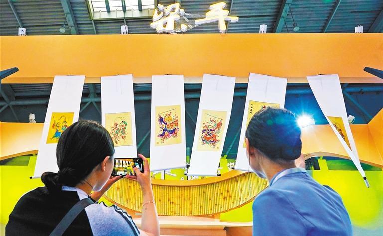 ▼9月22日,观众在第十三届重庆国际文化产业博览会上欣赏梁平木版年画。