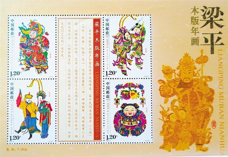 ▲2005年,由梁平木版年画制成的带邮资特种邮票面向全国发行。