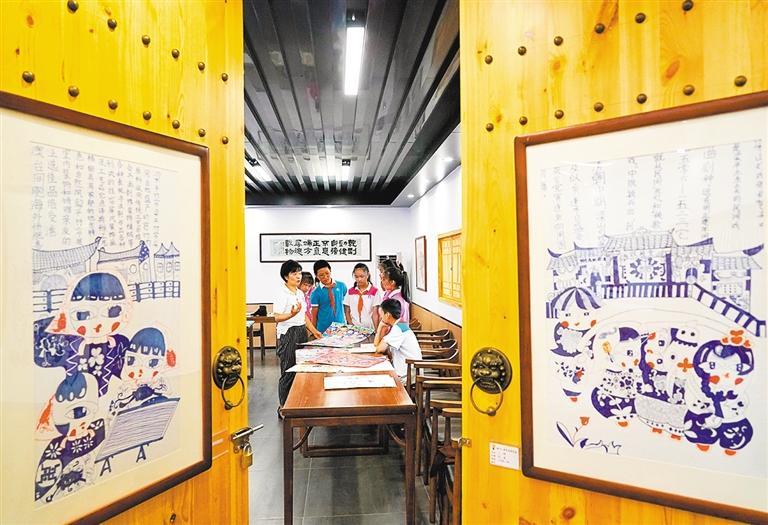 ◀九月二十日,重庆市梁平区实验小学,梁平木版年画市级代表性传承人莫绍萍(左一)正在向同学们介绍年画技艺。