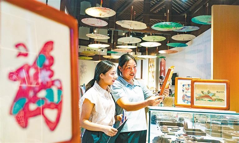 ▼9月19日,梁平区双桂田园景区非遗体验中心,游客在挑选木版年画文创产品。