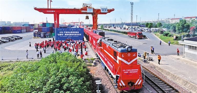 10月18日上午,载着90标准箱跨境电商货物的81972次“合德号”列车从义乌西站启程,驶往宁波舟山港,标志着义乌—宁波舟山港海铁联运“合德号”跨境电商专列成功开行。