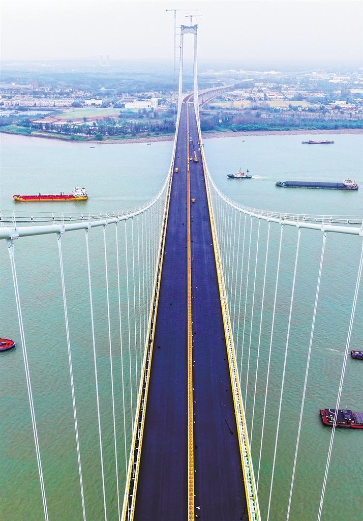 近日,位于江苏省境内的龙潭长江大桥主桥钢桥面铺装施工全部完成。该大桥建成通车后将强化南京的辐射带动作用,促进长三角一体化建设。方东旭摄(中经视觉)