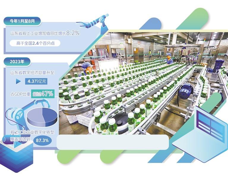 山东将制造业数字化提标行动作为产业数字化“八大行动”之首,实数融合发展不断取得新突破,制造业数字化转型先发优势全面拓展。今年1月至8月,全省规上工业增加值同比增长8.2%,高于全国2.4个百分点。2023年,全省数字经济总量升至4.3万亿元,占GDP比重超过47%,核心产业增加值占比达8.6%;全省规上工业企业数字化转型覆盖率达到87.3%;“两化”融合发展水平达67.5%,产业数字化指数、制造业数字化转型指数均居国内前列。