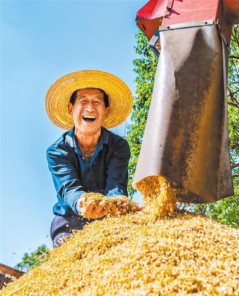▶10月10日,湖南省东安县紫溪市镇中心村,农民在高标准农田收获晚稻。今年前三季度,全国夏粮早稻产量合计17795万吨,比上年增加346万吨,增长2.0%。蔡小平摄(中经视觉)