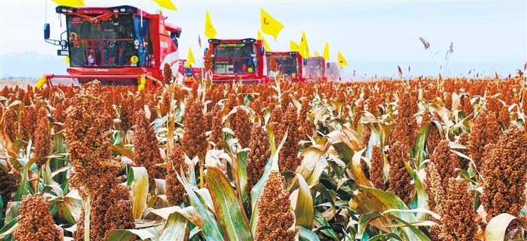 ▲10月16日,甘肃省张掖市民乐县有机红高粱种植基地,大型收割机在收割高粱。王 将摄(中经视觉)