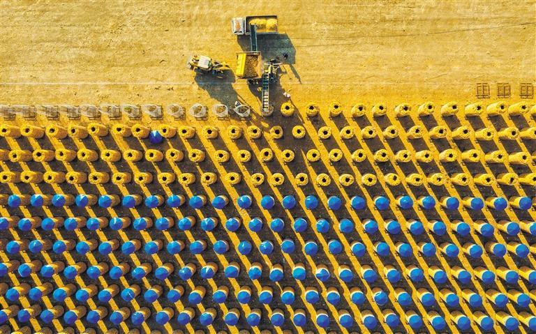 ▼10月15日,浙江省乐清市胜利塘内的“农光互补”光伏发电项目基地,农户将收割好的稻谷装袋。