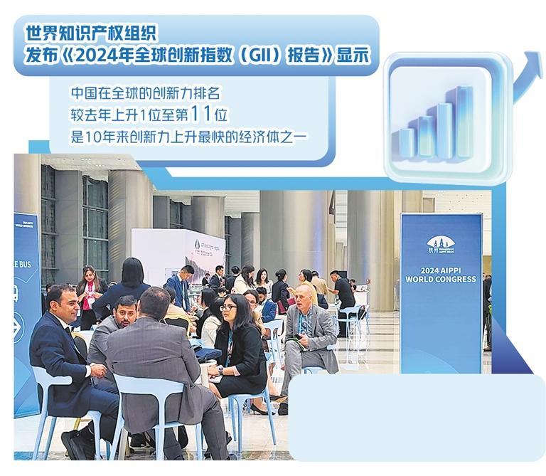 世界知识产权组织9月26日发布的《2024年全球创新指数(GII)报告》显示,中国在全球的创新力排名较去年上升1位至第11位,是10年来创新力上升最快的经济体之一。中国深入推进知识产权强国建设、持续加强知识产权法治保障的努力得到了国际知识产权界的广泛认可。