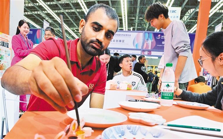 ▼10月19日,外国游客在景德镇国际陶博城主会场体验画陶瓷。瓷博会正在成为生动展示国家陶瓷文化传承创新试验区建设成果的独特窗口、陶瓷行业“买全球、卖全球”的开放平台。杨继红摄(中经视觉)