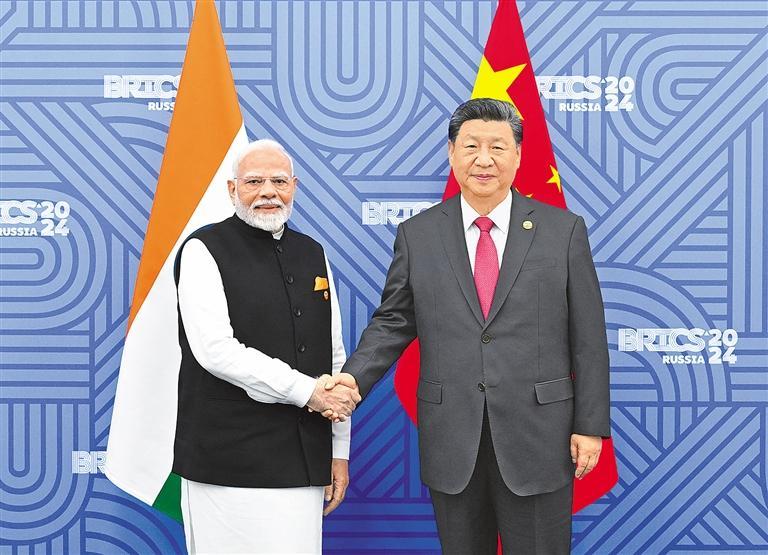 习近平指出,中国和印度同为文明古国、发展中大国、全球南方重要成员,都处在各自国家现代化建设的关键时期。中印正确把握历史潮流和两国关系发展方向,符合两国和两国人民根本利益。双方应该加强沟通合作,增进战略互信,相互成就彼此发展梦想。双方也要肩负起国际责任,为广大发展中国家联合自强作出表率,为推动世界多极化、国际关系民主化作出贡献。