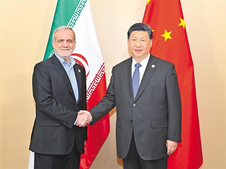 佩泽希齐扬表示,中国是伊朗最重要的合作伙伴,伊中全面战略伙伴关系及各领域合作保持良好发展势头。伊方希同中方共同努力,落实好两国全面合作计划,推动两国在互联互通、基础设施、清洁能源等领域深化合作,取得更多成果,这不仅将助力伊朗国家发展,也有助于促进地区和平与稳定。伊方愿同中方继续在涉及彼此核心利益问题上坚定相互支持,共同反对霸权霸凌。感谢中方支持伊朗正式加入金砖合作机制,期待同中方在金砖国家等多边平台密切协作。