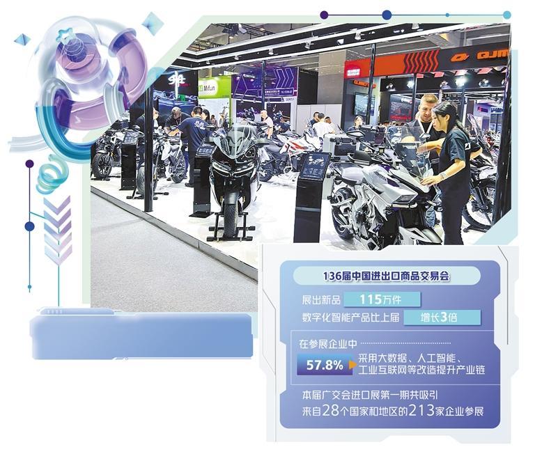 商务部中国对外贸易中心主任储士家介绍,本届广交会展出新品数量达115万件,数字化智能产品比上届增长3倍。在参展企业中,57.8%采用大数据、人工智能、工业互联网等改造提升产业链。接连亮相的“黑科技”产品,呈现出智能化、绿色化、数字化等特点趋势,折射出我国外贸新亮点和不断积累的新优势。