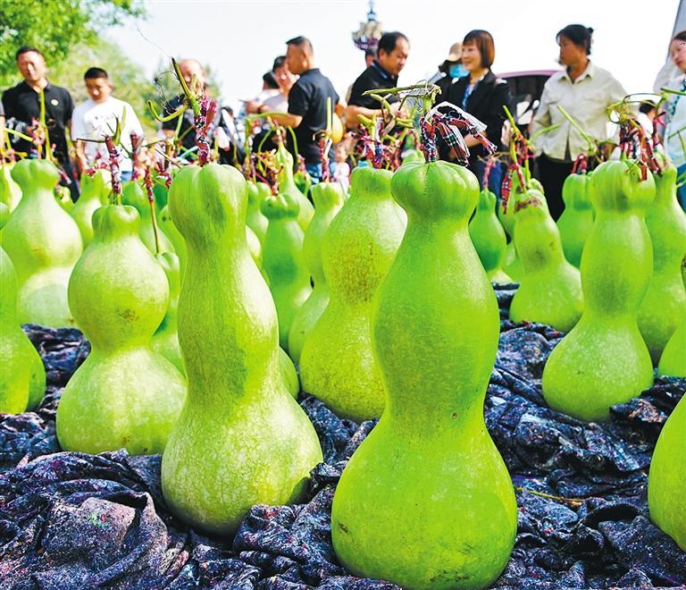 ▼10月12日,消费者在山东聊城市东昌府区第十六届中国江北水城·两河明珠葫芦文化艺术节上选购莲花头葫芦。葫芦是聊城的特色产业,东昌府区葫芦种植面积达3万余亩。