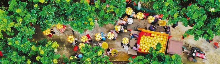 ◀10月18日,贵州省黔南州罗甸县上隆村,村民在装运柚子。罗甸县柚子种植面积达8600亩。