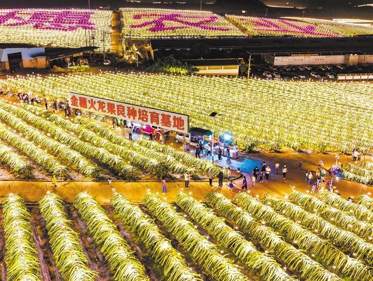 ◀10月7日,游客在广西南宁市隆安县那桐镇火龙果产业示范区欣赏万亩火龙果夜景。隆安县大力发展火龙果特色产业,激发农旅融合新活力。