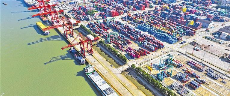 10月24日,江苏省苏州港张家港港区集装箱码头车来船往,一派繁忙景象。今年前三季度,苏州市实现外贸进出口总值19115.8亿元人民币,同比增长7.9%。