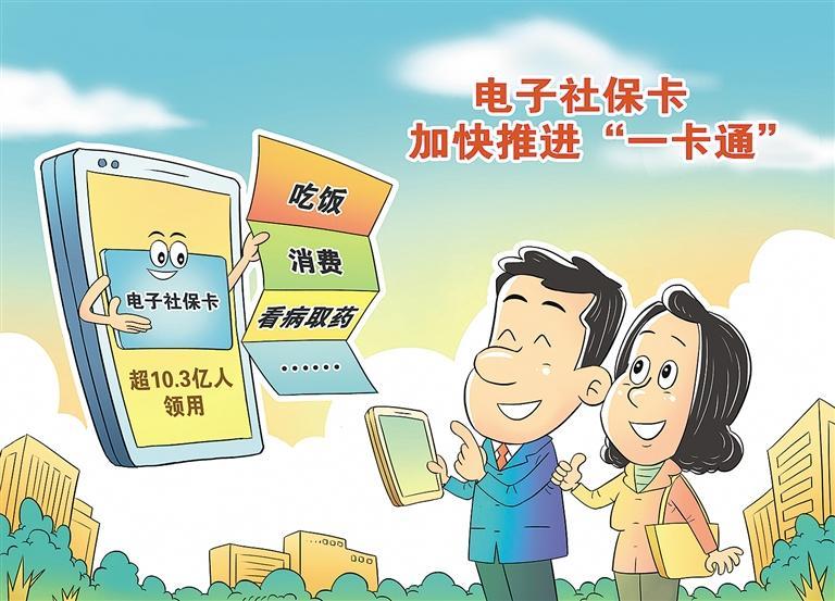 吃饭、消费、缴纳水电费……如今,一张社保卡就能满足居民大多数日常生活需求。数据显示,截至2024年9月底,全国社保卡持卡人数达13.86亿人,覆盖98.3%的人口,其中超10.3亿人同时在手机中领用了电子社保卡。作为社保卡的线上形态和电子证照,电子社保卡与实体社保卡一一对应、功能相通,是持卡人享受服务的电子凭证和结算工具。加快推进电子社保卡“一卡通”不仅提高了公共服务的便利化水平,增强了民生福祉,还促进了跨省通用和区域经济的融合发展。应把更多民生服务纳入电子社保卡中,深入推动电子社保卡在社保服务、就医购药、交通出行等领域的应用,向群众提供“一站式”服务,加载更多便捷服务的“小卡片”,也将更好服务“大民生”。(时 锋)
