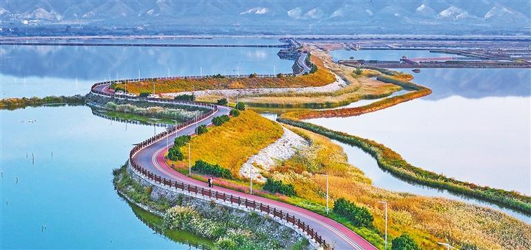 10月27日,市民在山西省运城市盐湖区鸭子池湿地公园的彩虹步道上游玩赏景。经过近年来的综合治理与保护性修复,该湿地公园的生态环境得到极大改善,成为市民休闲娱乐的好去处。常 奇摄(中经视觉)