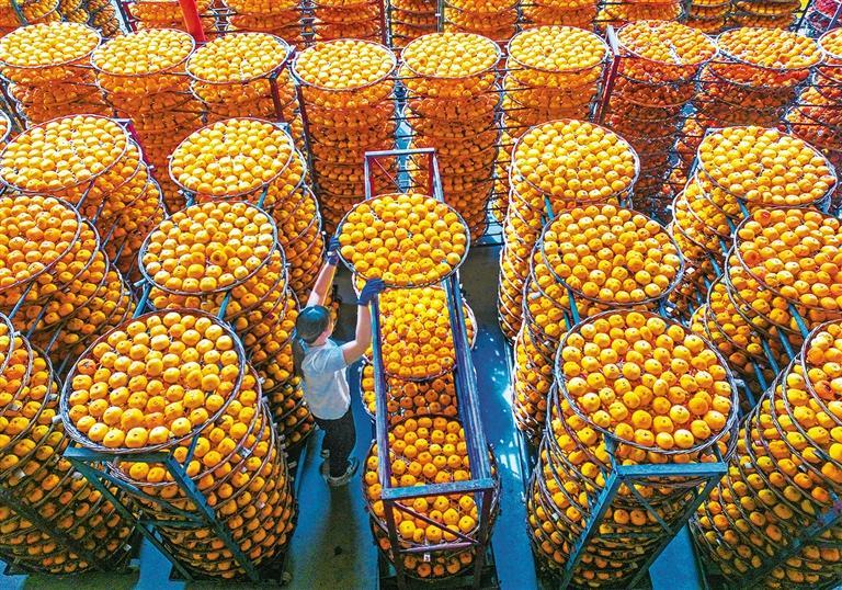 10月27日,广西桂林市平乐县二塘镇牛角村,农户在晾晒柿饼。近年来,平乐县做大做强柿子产业,柿饼加工产业成为当地农民增收的特色产业。蒋克青摄(中经视觉)