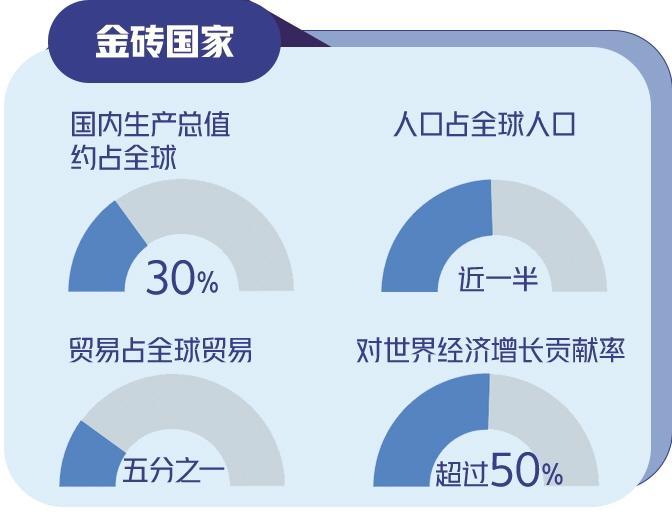 今年是“大金砖合作”开局之年。扩员后,金砖国家国内生产总值约占全球30%、人口占全球人口近一半、贸易占全球贸易五分之一,金砖成色更足、分量更重、潜能更大。