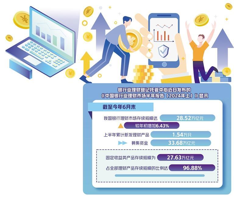 在今年上半年整体居民风险偏好低位,叠加债券牛市的环境下,理财业绩展示具有较强吸引力,有利于固定收益类理财规模增长。截至2024年6月末,固定收益类产品存续规模为27.63万亿元,占全部理财产品存续规模的比例达96.88%。