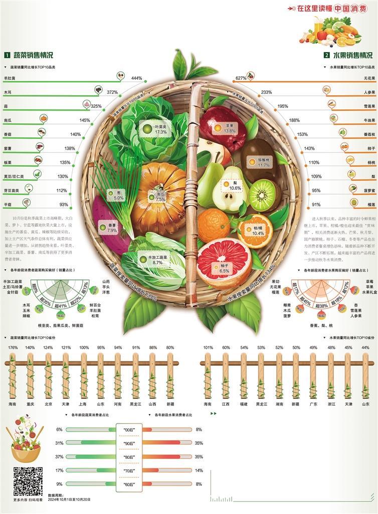 旦夕凉风至,渐知秋实美,田间地头瓜熟果香。随着天气转凉,品种丰富的时令果蔬陆续上市,蔬菜水果消费进一步提升,蔬果篮子变得愈发丰盛。线上消费数据显示,蔬菜搜索量同比增长139%,水果搜索量同比增长134%,越来越多消费者关注饮食结构均衡。