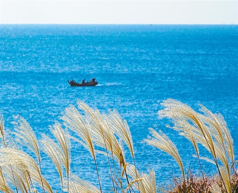 ▼10月28日,山东省青岛西海岸新区鱼鸣嘴海岸边,芦花、大海、渔船构成一幅美丽的金秋画卷。
