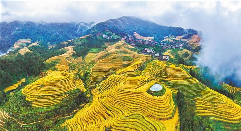 ◀10月27日,广西桂林市龙胜县龙脊梯田云雾缭绕,金黄的稻谷和民居相映成景。