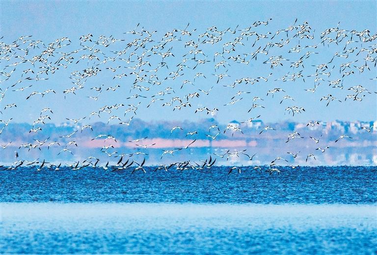◀10月27日,江西省鄱阳县鄱阳湖湿地上空,东方白鹳展翅飞翔。当地将候鸟保护纳入林长制责任范围,通过栖息地保护修复、科学设置观鸟范围等方式保护候鸟资源。