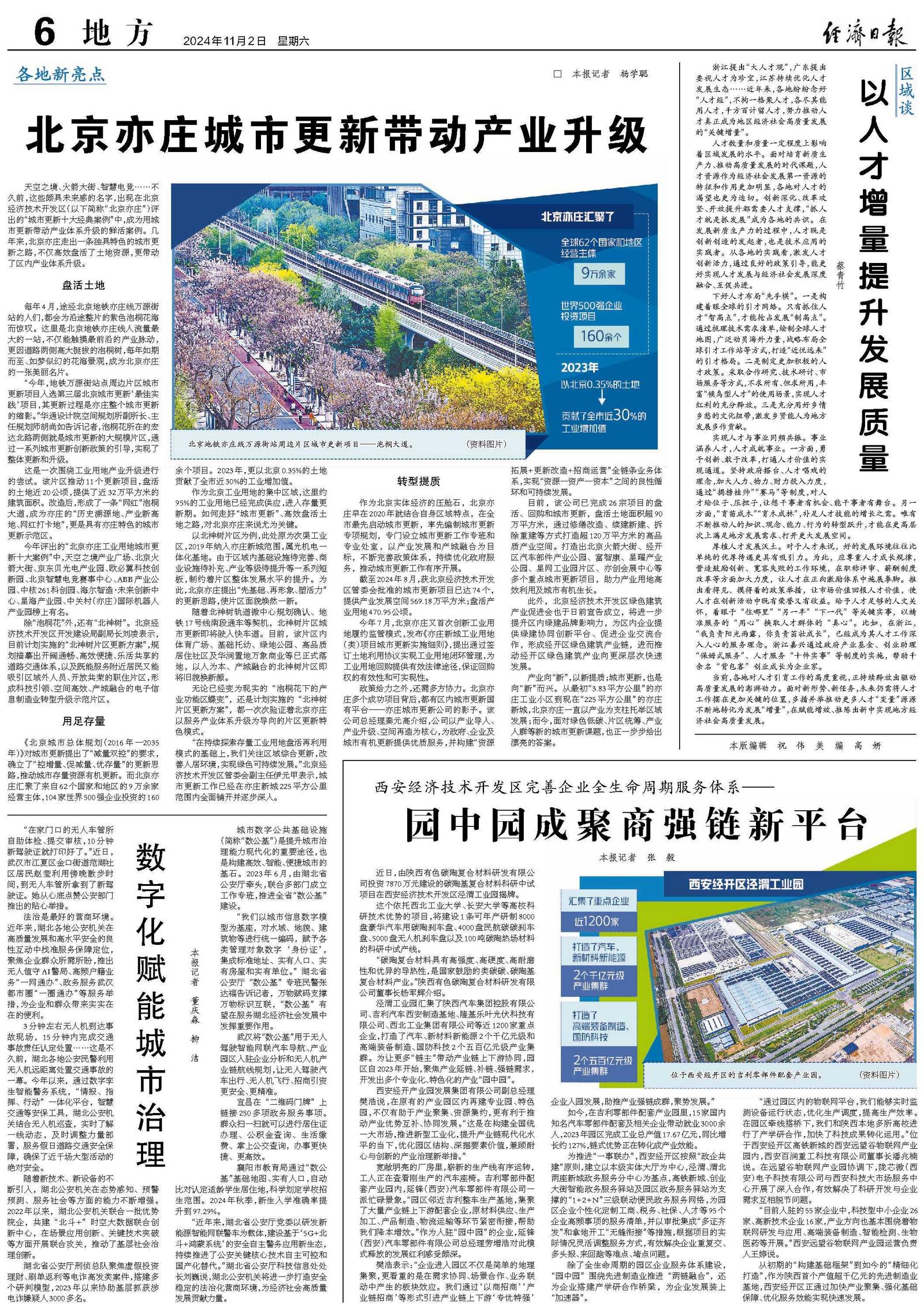 目前,该公司已完成26宗项目的盘活、回购和城市更新,盘活土地面积超90万平方米,通过修缮改造、续建新建、拆除重建等方式打造超120万平方米的高品质产业空间。打造出北京火箭大街、经开区汽车部件产业公园、富智康、星曜产业公园、星网工业园片区、亦创会展中心等多个重点城市更新项目,助力产业用地高效利用及城市有机生长。