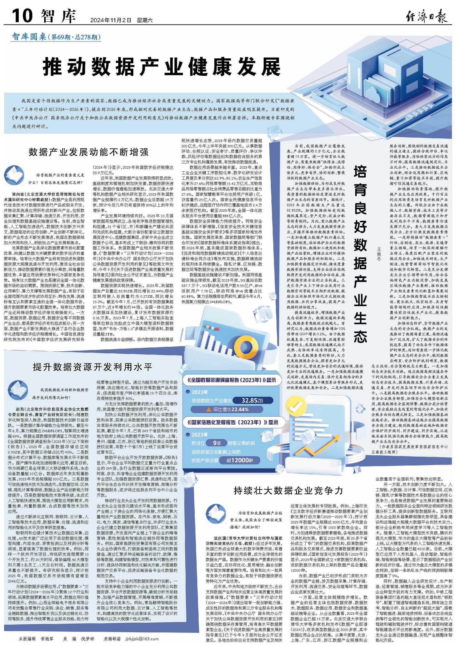 张向宏(北京交通大学信息管理理论与技术国际研究中心特聘教授):数据产业是利用现代信息技术对数据资源进行产品或服务开发,并推动其流通应用所形成的新兴产业,包括数据采集汇聚、计算存储、流通交易、开发利用、安全治理和数据基础设施建设等。当前,商业智能、人工智能加速迭代,数据技术创新方兴未艾,数据驱动的应用创新、产业创新不断深化,新的产业形态不断发展演进,我国在数据领域加大布局和投入,积极抢占产业发展制高点。