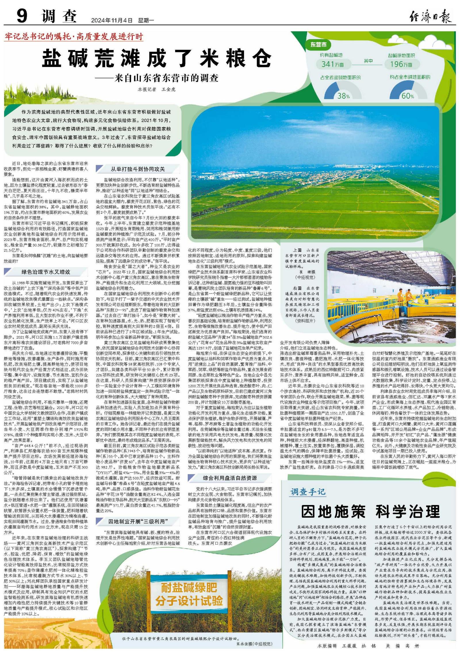 作为滨海盐碱地的典型代表性区域,近年来山东省东营市积极做好盐碱地特色农业大文章,践行大食物观,构建多元化食物供给体系。2021年10月,习近平总书记在东营市考察调研时强调,开展盐碱地综合利用对保障国家粮食安全、端牢中国饭碗具有重要战略意义。3年过去了,东营探寻盐碱地综合利用走过了哪些路?取得了什么进展?收获了什么样的经验和启示?