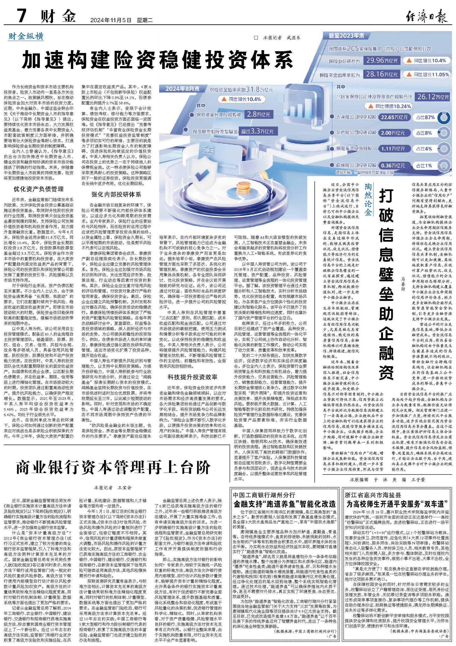 近年来,保险资金投资逐步向养老金融和绿色金融领域倾斜,以应对市场需求和经济高质量发展的要求。各大保险集团纷纷通过产品创新与数字化手段,将投资战略与公司长远发展相结合,提升市场竞争力和品牌影响力。“保险企业要不断引入数字化手段,以便提升投资决策的效率和优化用户的体验。”中国人寿资产管理有限公司副总裁赵晖表示,科技创新已不可阻挡,随着AI和大语言模型的突破发展,人工智能技术正在重塑金融业,未来会有越来越多的资管机构将投资分析工作置换为人工+智能系统,形成差异化的竞争优势。