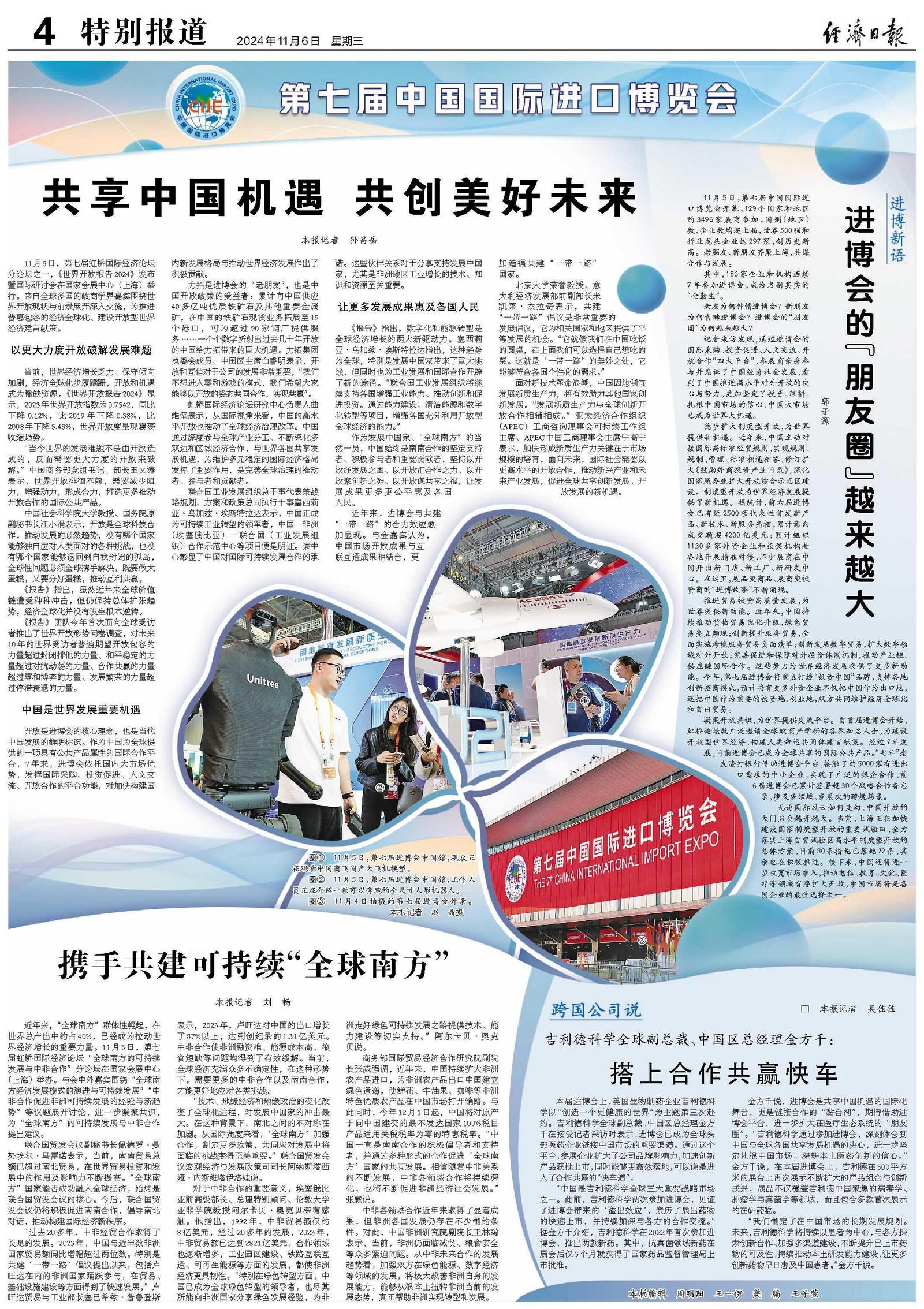 本届进博会上,美国生物制药企业吉利德科学以“创造一个更健康的世界”为主题第三次赴约。吉利德科学全球副总裁、中国区总经理金方千在接受记者采访时表示,进博会已成为全球头部医药企业链接中国市场的重要渠道。通过这个平台,参展企业扩大了公司品牌影响力,加速创新产品获批上市,同时能够更高效落地,可以说是进入了合作共赢的“快车道”。