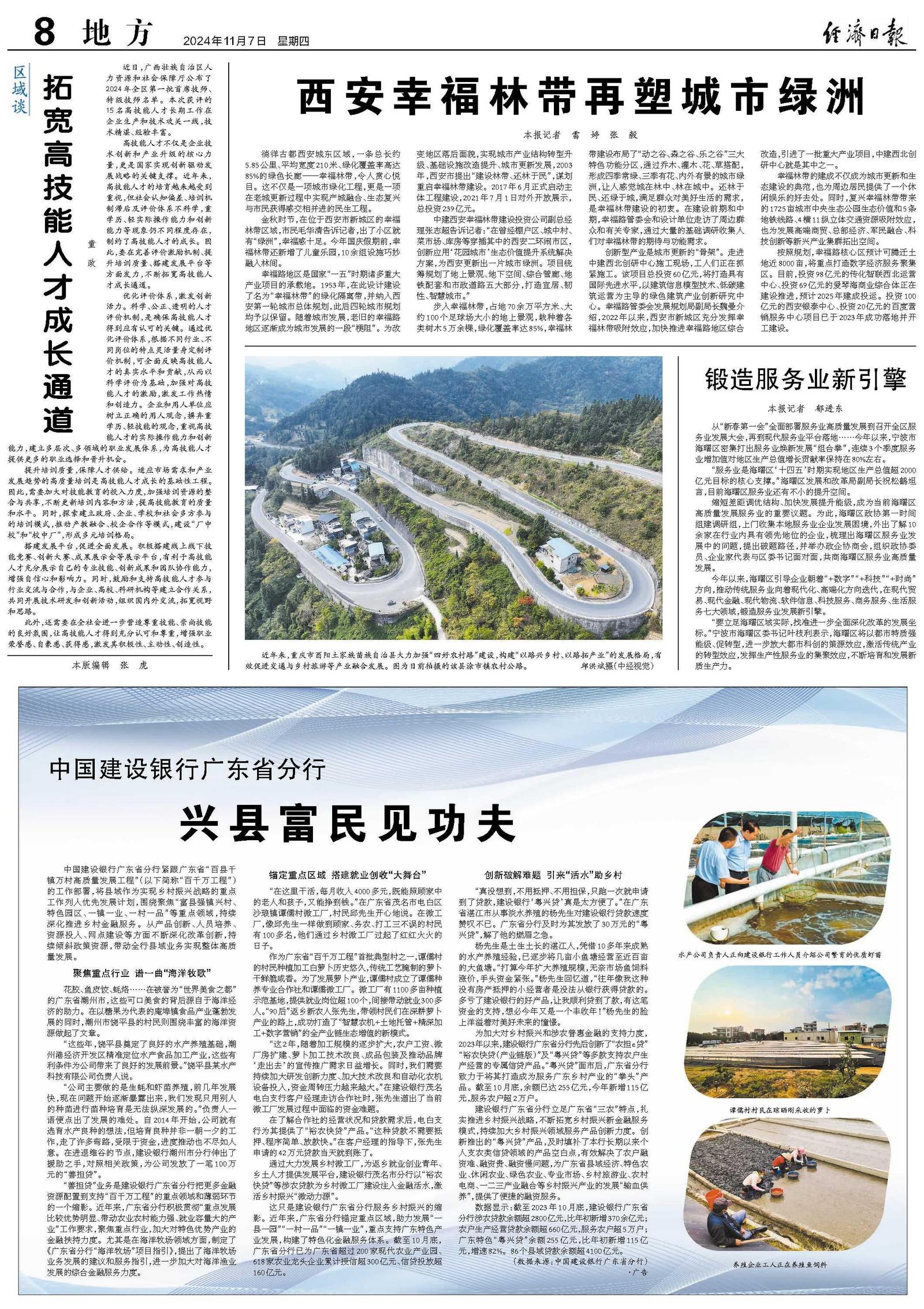 数据显示:截至2023年10月底,建设银行广东省分行涉农贷款余额超2800亿元,比年初新增370余亿元;农户生产经营贷款余额超660亿元,服务农户超5万户;广东特色“粤兴贷”余额255亿元,比年初新增115亿元,增速82%。86个县域贷款余额超4100亿元。